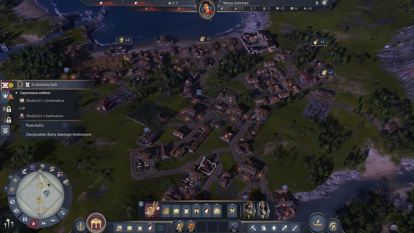 Seria Anno nigdy nie była znana z głębokiej narracji, ale Pax Romana naprawdę zaskakuje – i to pozytywnie. Tym razem wcielamy się w jedno z dwojga rodzeństwa wysłanych przez samego Cesarza, by ogarnąć chaos na wyspie zniszczonej przez wybuch wulkanu. Brzmi poważnie? To dopiero początek. Kampania ma sporo rozgałęzień, a do tego nie brakuje w niej zwrotów akcji, które tłumaczą kolejne mechaniki gry, nie sprawiając przy tym wrażenia „samouczka”.