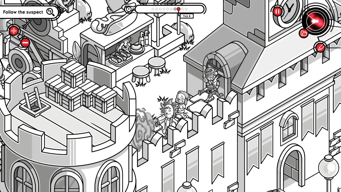 Na szczęście każdy z okresów historycznych ma dodatkowy tryb, który niezwykle przypadł mi do gustu. Polega on na śledzeniu kilku postaci poprzez przeskakiwanie pomiędzy czasowymi wycinakami. Nie dość, że te osoby są żywcem wyjęte z dobrze znanych marek, to jeszcze nikt nam co chwilę nie zawraca głowy. Bardzo podobało mi się śledzenie podrób Ricka i Morty’ego czy odkrycie tajemnicy pisarza opartego o H. P. Lovecrafta. Szkoda tylko, że aby odblokować dostęp to tej opcji, trzeba ukończyć całkiem sporą część fabuły.