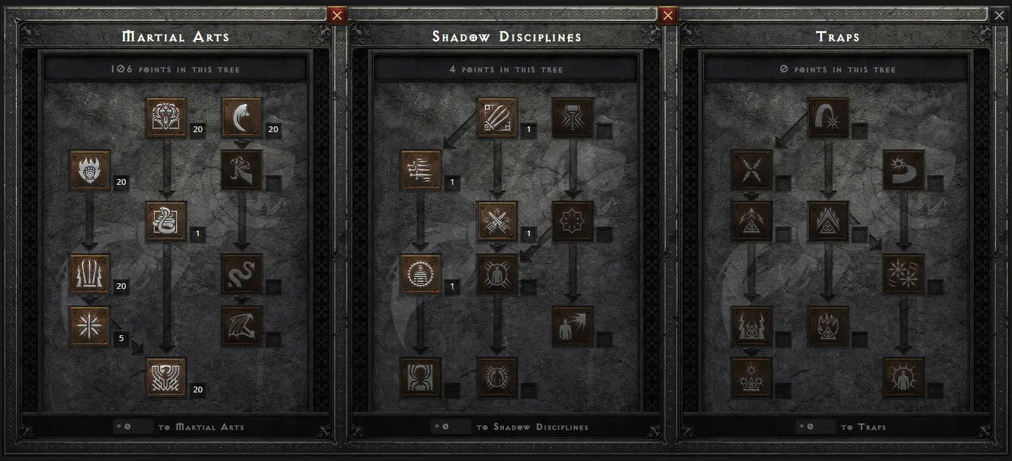 Podstawą naszych ataków są umiejętności z drzewka Sztuki Walki (ang. Martial Arts). Kolejność maksowania skilli wygląda następująco: