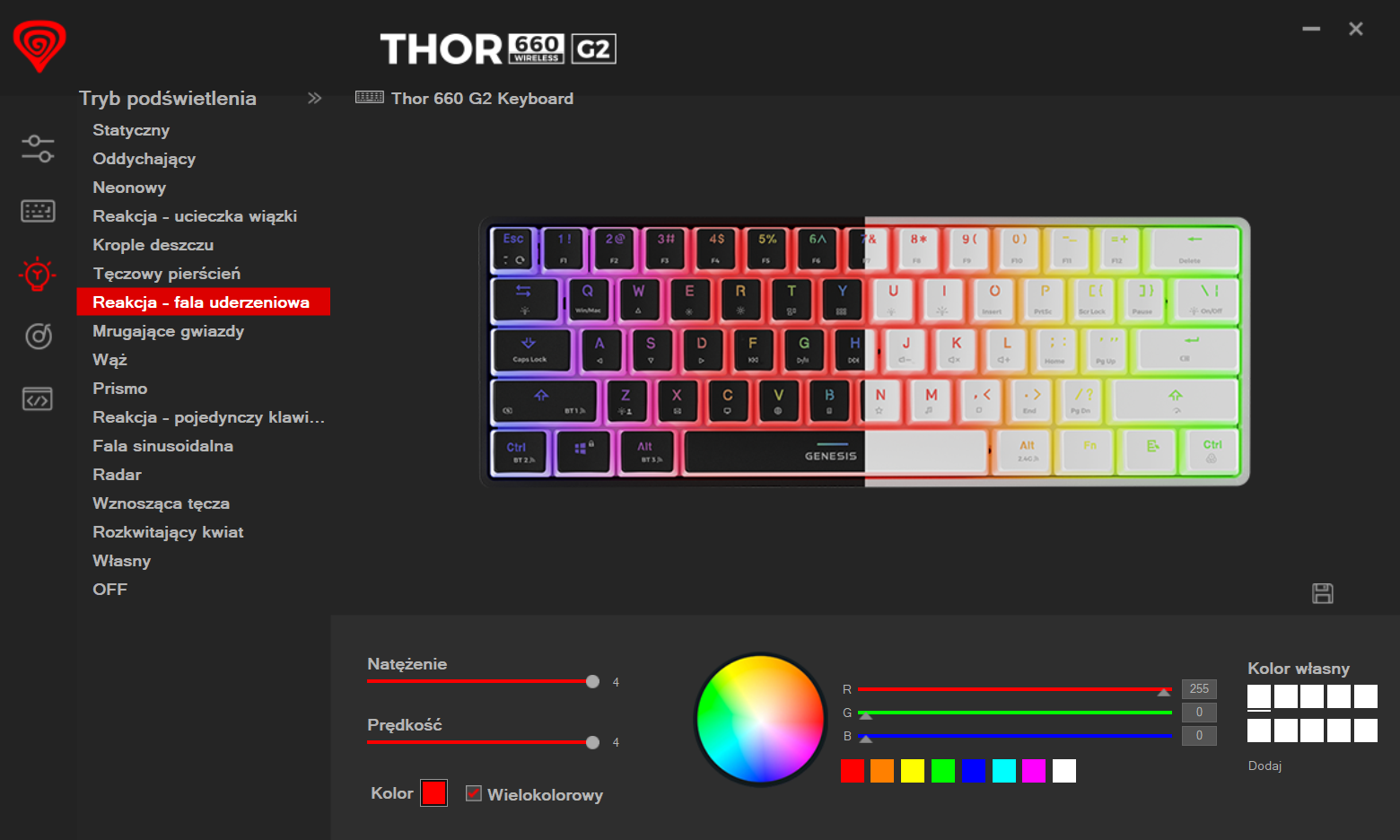 Z poziomu aplikacji możemy również zarządzać podświetleniem RGB. Do dyspozycji mamy szesnaście presetów świecenia klawiszy, zarówno podczas ich aktywacji, jak i w trybie stałym. Dodatkowo dostępnych jest dziesięć konfiguracji reakcji podświetlenia na dźwięki systemowe.