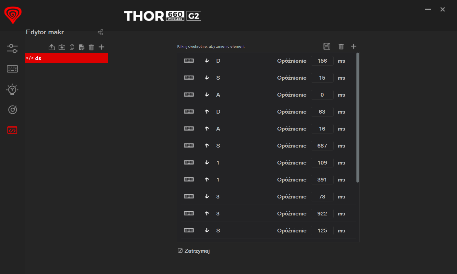 Klawiatura oferuje także funkcję makr, które można organizować w folderach w pamięci wewnętrznej urządzenia. Proces ich tworzenia jest intuicyjny, jednak dość podstawowy – opiera się wyłącznie na rejestracji częstotliwości kliknięć bez możliwości ręcznej modyfikacji. W rezultacie precyzyjne ustawienie makr wymaga polegania głównie na własnym wyczuciu.
