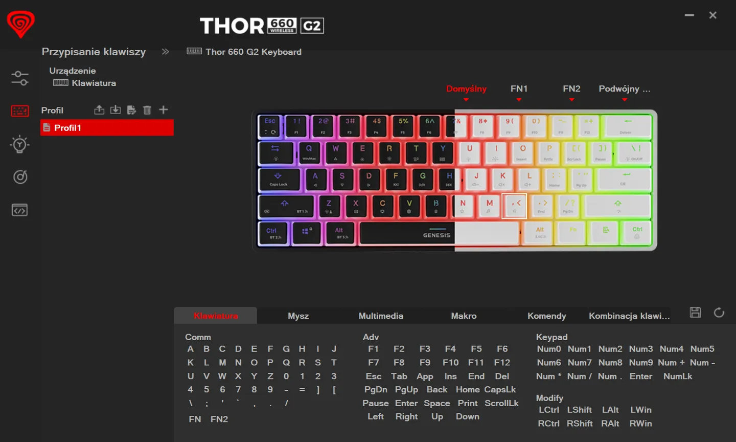 Oprogramowanie Genesis pozytywnie wyróżnia się na tle konkurencji. Aplikacja jest responsywna i czytelna zdecydowanie bardziej niż program Corsaira, choć wciąż ustępuje Razer Synapse. To oczywiście subiektywna ocena, jednak nie można odmówić jej funkcjonalności. Thor 660 G2 mimo swoich niewielkich rozmiarów oferuje możliwość rozszerzenia funkcji poprzez oprogramowanie. Przykładowo, zaimplementowałem brakujące strzałki pod kombinacją FN+W/S/A/D, co znacznie ułatwia nawigację podczas montażu filmów. To tylko jedna z wielu możliwości personalizacji, ale w moim odczuciu jedna z najistotniejszych.