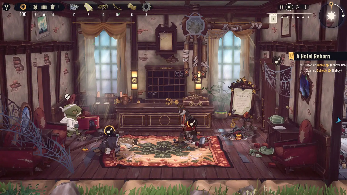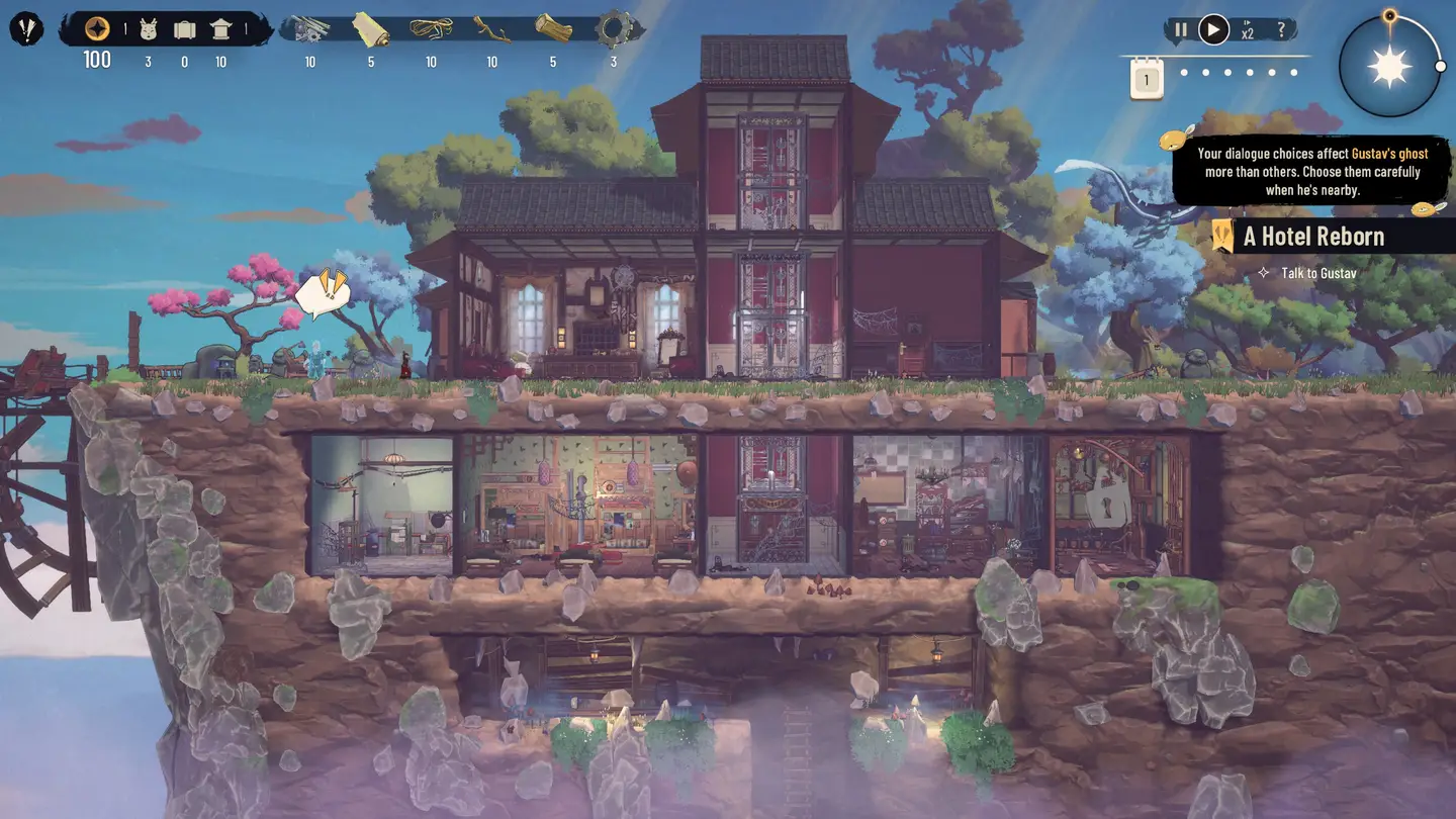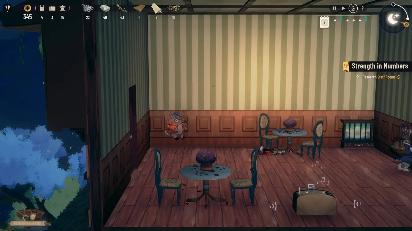 Na początku przygody mamy dostęp tylko do kilku pokojów. Aby rozbudować nasz wspaniały hotel, potrzebne są odpowiednie zasoby, które możemy zdobyć, ścinając drzewa oraz rozwalając kamienie spokojnie stojące sobie na tyłach posesji. Niestety z tym też było kilka niedogodności. Nie wszystkie przedmioty pojawiały się na pasku dóbr. Wydaje mi się, że zniszczyłem wszystkie głazy, zanim zdałem sobie sobie sprawę, że po prostu ich liczba się nie wyświetla. Oprócz stawiania nowych pomieszczeń mamy także możliwość tworzenia różnego rodzaju dekoracji. Sporo z nich jest zablokowana i zanim wypełnimy nimi puste przestrzenie, trzeba je będzie wynaleźć. Do tego celu służy zupełnie inny rodzaj zasobów generowany przez odwiedzających nas kosmitów.
