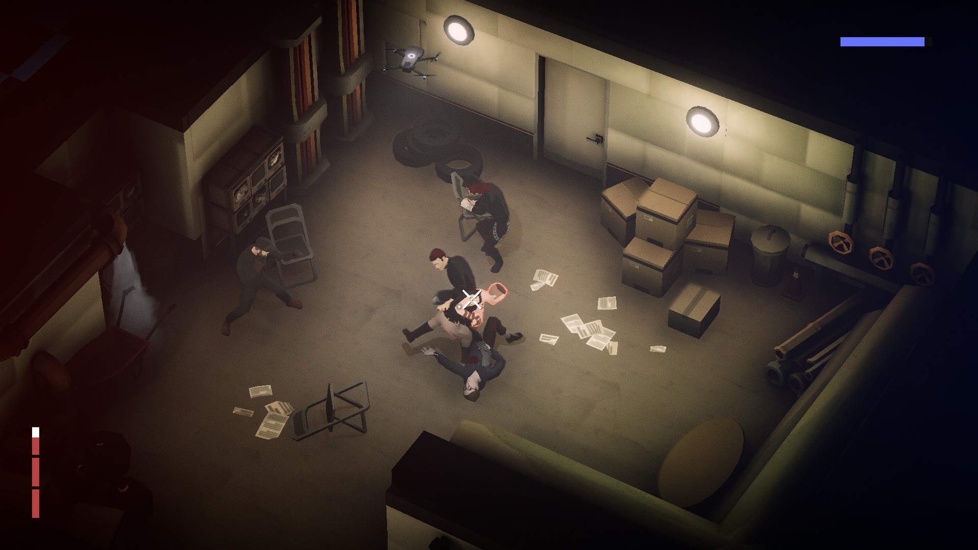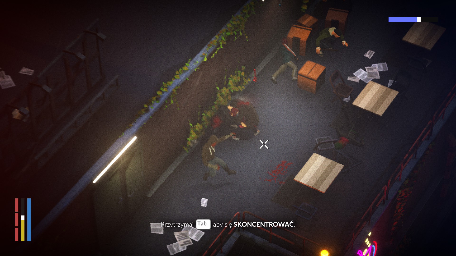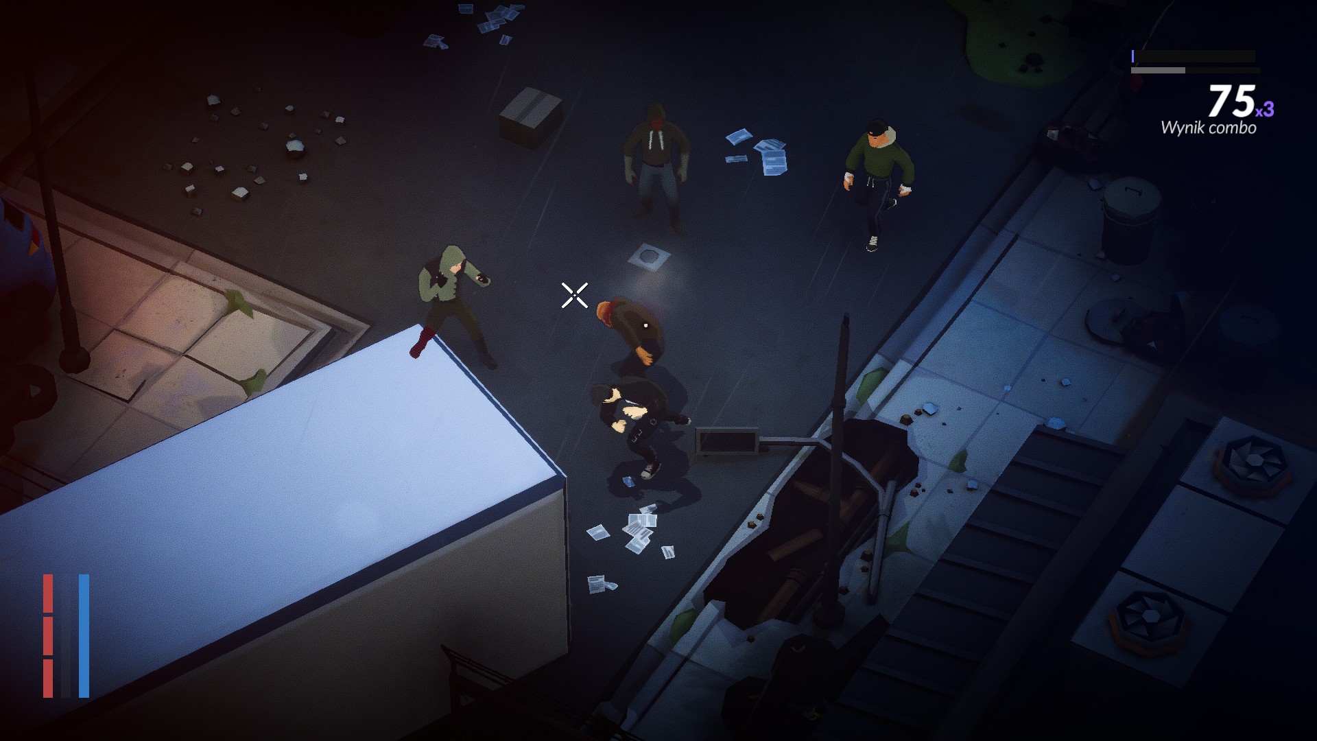Midnight Fight Express stawia przede wszystkim na szybką, bezkompromisową akcję. Fabuła, jak i przerywniki filmowe nie mają tu wielkiego znaczenia, wręcz przeciwnie – one mają tylko dawać pretekst do jatki. Akcję w grze obserwujemy z rzutu izometrycznego i moim zdaniem jest to bardzo dobry ruch! Ta perspektywa daje większe pole widzenia wrogów oraz przedmiotów, jakich możemy użyć w trakcie intensywnych pojedynków. Choć graczom wysuwają się skojarzenia z Hotline Miami, gra Humble Games przypomniała mi z kolei o kultowym Fighting Force.
