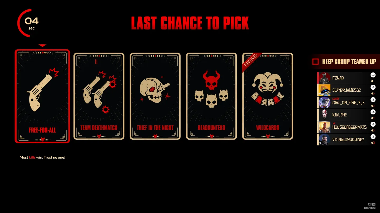 Dostępne tryby gry to: Free for All, Team Deathmatch, Theft in the Night, Headhunters oraz Wildcards. I tutaj pojawia się pewien problem — trudno zagrać w coś innego niż TDM, FFA czy Wildcards, ponieważ pozostałe praktycznie nie są wybierane przez graczy. Tak naprawdę jedyne, co mogę o nich powiedzieć, to że zwyczajnie istnieją.