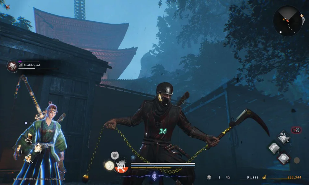 W moim przypadku to właśnie kusarigamy okazały się najbardziej naturalnym wyborem na dłuższą metę. Ich zasięg i tempo pozwalały bezpiecznie inicjować starcia, a jednocześnie utrzymywać presję na przeciwniku bez konieczności ciągłego wchodzenia w zwarcie. Zarazem była to broń wyjątkowo bezlitosna dla błędów — zbyt długie serie ataków szybko prowadziły do wyczerpania zasobów, co w Nioh 3 niemal zawsze kończy się śmiercią. To właśnie przy kusarigamach najmocniej czuć, jak gra uczy kontroli tempa walki.