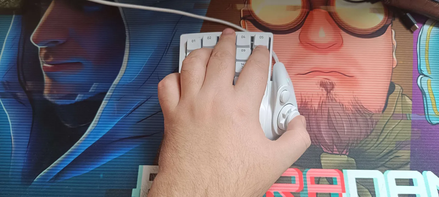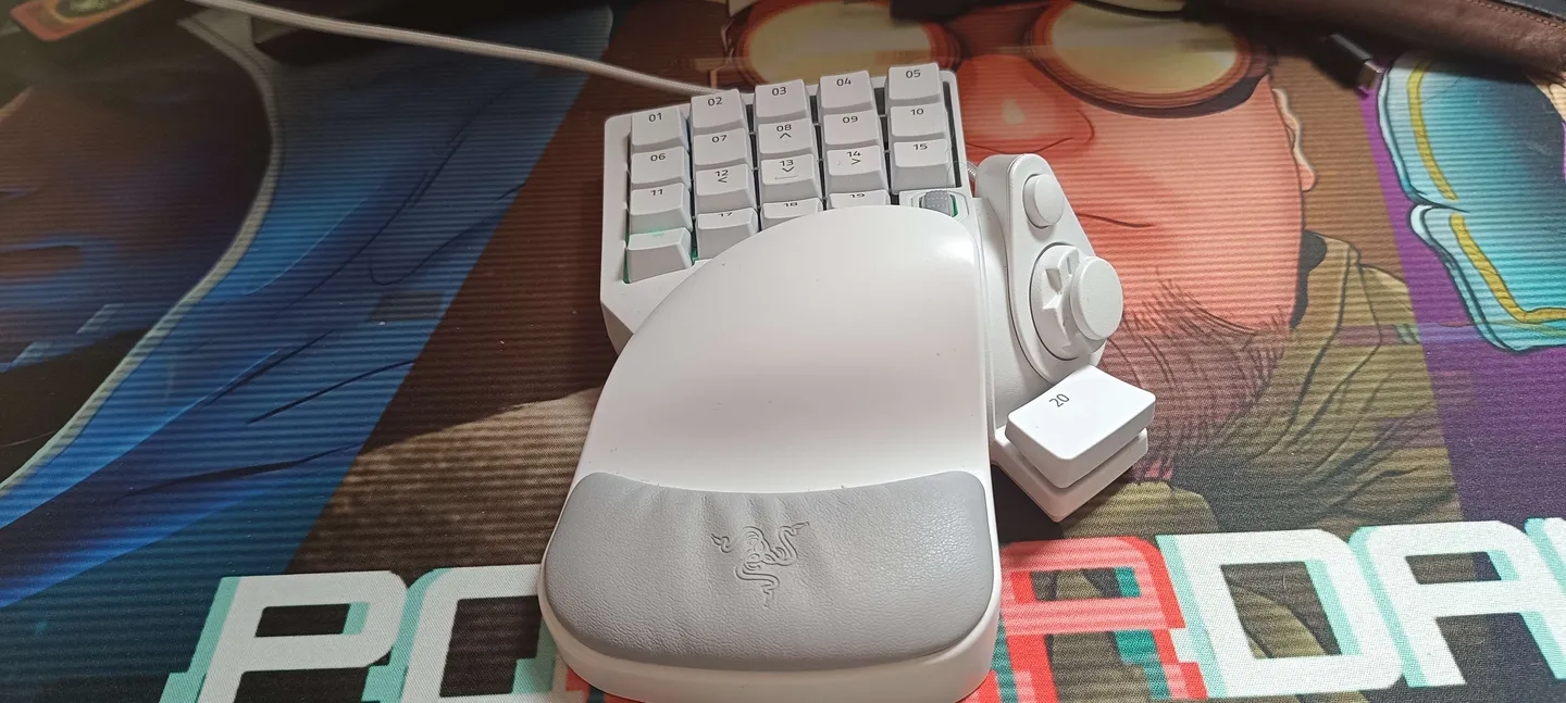 Górna część urządzenia to 19 przycisków, które możemy w pełni skonfigurować do naszych potrzeb za pomocą programu Razer Synapse. Przykładowo, grając w World of Warcraft, podczas testów pierwszy rząd przycisków odpowiadał u mnie za przypisane do paska akcji od 1 do 5. Drugi rząd odpowiadał za umiejętności z cooldownem (czyli takie, których nie można używać cały czas), a trzeci przypisałem do umiejętności wspomagających moją przeżywalność oraz wpływających na zwiększenie mobilności postaci. Do poruszania się używałem analoga, który idealnie leży pod kciukiem. Między analogiem/d-padem a blokiem przycisków znajduje się scroll do przewijania. Na panelu, gdzie jest analog/d-pad, zostały umiejscowione 2 przyciski: pod analogiem znajduje się klawisz funkcyjny n20, odpowiadający domyślnie za spację, a nad nim przycisk pozwalający przełączać się między profilami oraz diody informujące nas o tym, który z nich jest danej chwili w użyciu