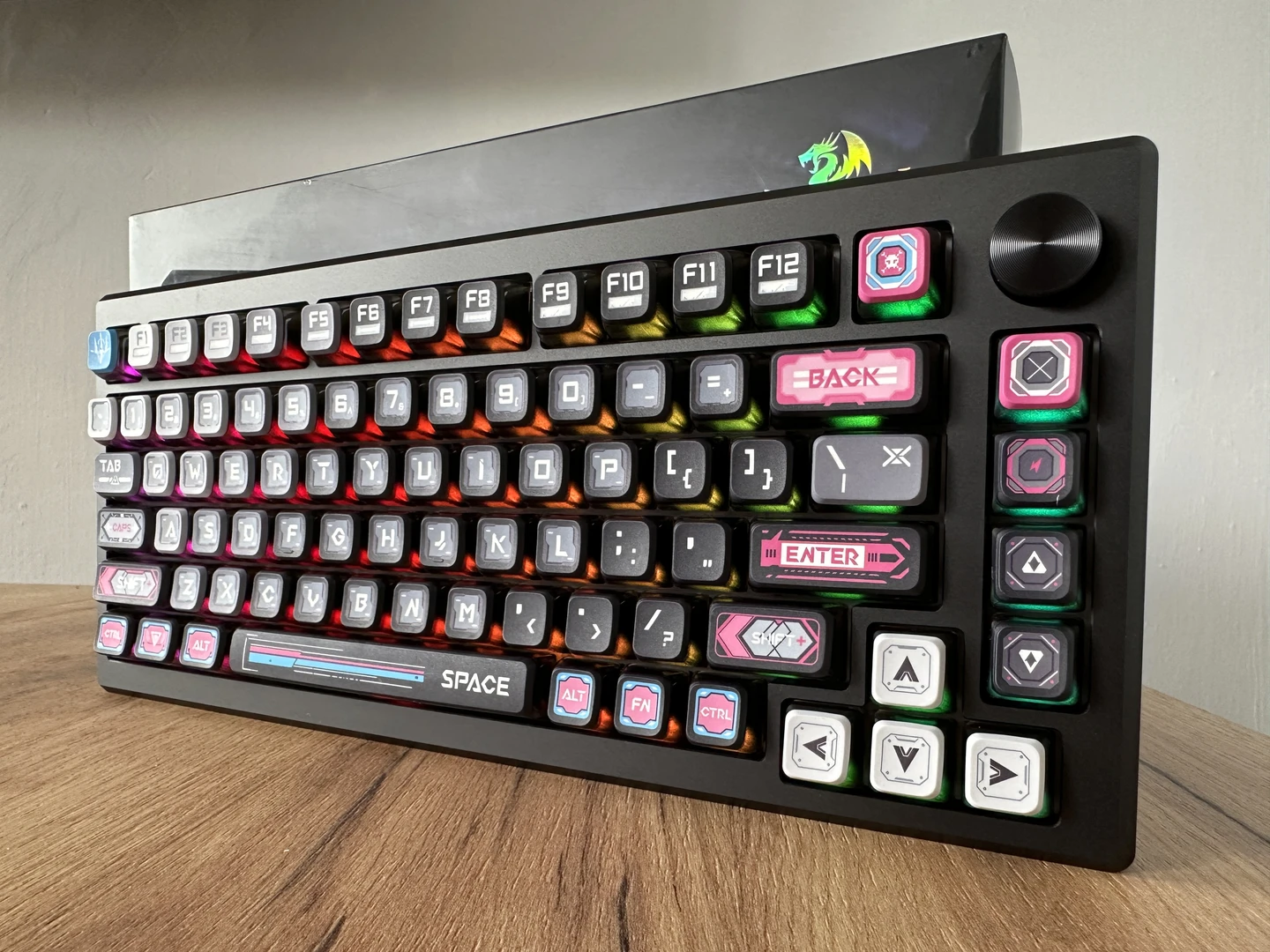 Skłamałbym, gdybym napisał, że wygląd nie ma dla mnie znaczenia. Ma i to dość duży. Pierwsze, co przychodzi mi do głowy, to styl serii Borderlands, czy to za sprawą czcionki na keycapach, czy zastosowanego wzornictwa graficznego. Jest w tym wszystkim pewna magia, kojarząca się raczej z zaawansowaną technologią niż fantasy. Trudno oderwać wzrok od całego projektu, a głęboka czerń obudowy tylko uzupełnia pozytywne wrażenia. Gdybym miał oceniać „klawiaturę po pudełku”, to tutaj dałbym od razu dziesięć na dziesięć i po testach nie zmieniłem zdania. Piękny kawałek sprzętu.