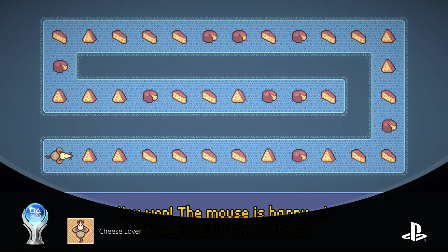 Tym razem zacznę od pozycji, w której, aby zdobyć sto procent trofeów, nie trzeba nawet ukończyć wszystkich plansz. Copy the Line polega na odtworzeniu przygotowanych przez twórców kształtów. Nie jest to absolutnie nic trudnego i wymaga co najwyżej czterech szarych komórek. Aby trochę urozmaicić te siedem minut, które poświęciliśmy na wbicie platyny, wymienialiśmy się padem po każdym poziomie. W ten sposób każdy z nas musiał odwzorować po piętnaście wzorów. Gdy tylko ułożyliśmy trzydziesty model, wskoczył ostatni „aczik”, a my mogliśmy przeskoczyć do następnego tytułu. Wspomnę jeszcze, że produkcja jest obecnie dostępna na promocji i kosztuje całe 4,05 zł (do 08.01). Jeśli czujecie się bogaci i macie ochotę na dwie szybkie platyny, to zawsze możecie złapać wersję na PS4 oraz PS5.