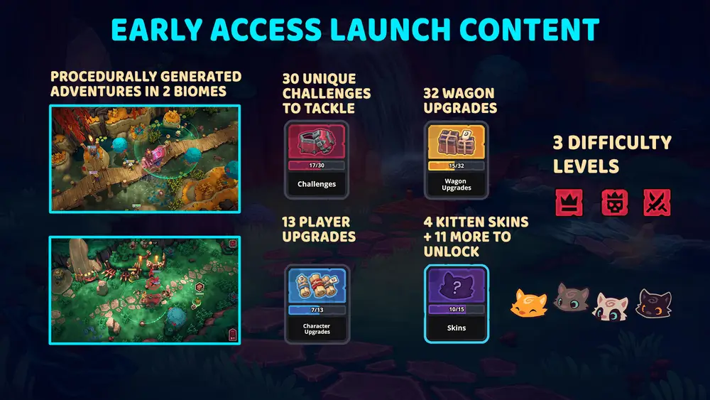 Jeżeli macie ochotę wybrać się ze znajomymi na kocią przygodę, serdecznie zapraszam na platformę Steam. 9 grudnia 2024 gra została wydana w formacie Early Access i na ten moment zawiera: